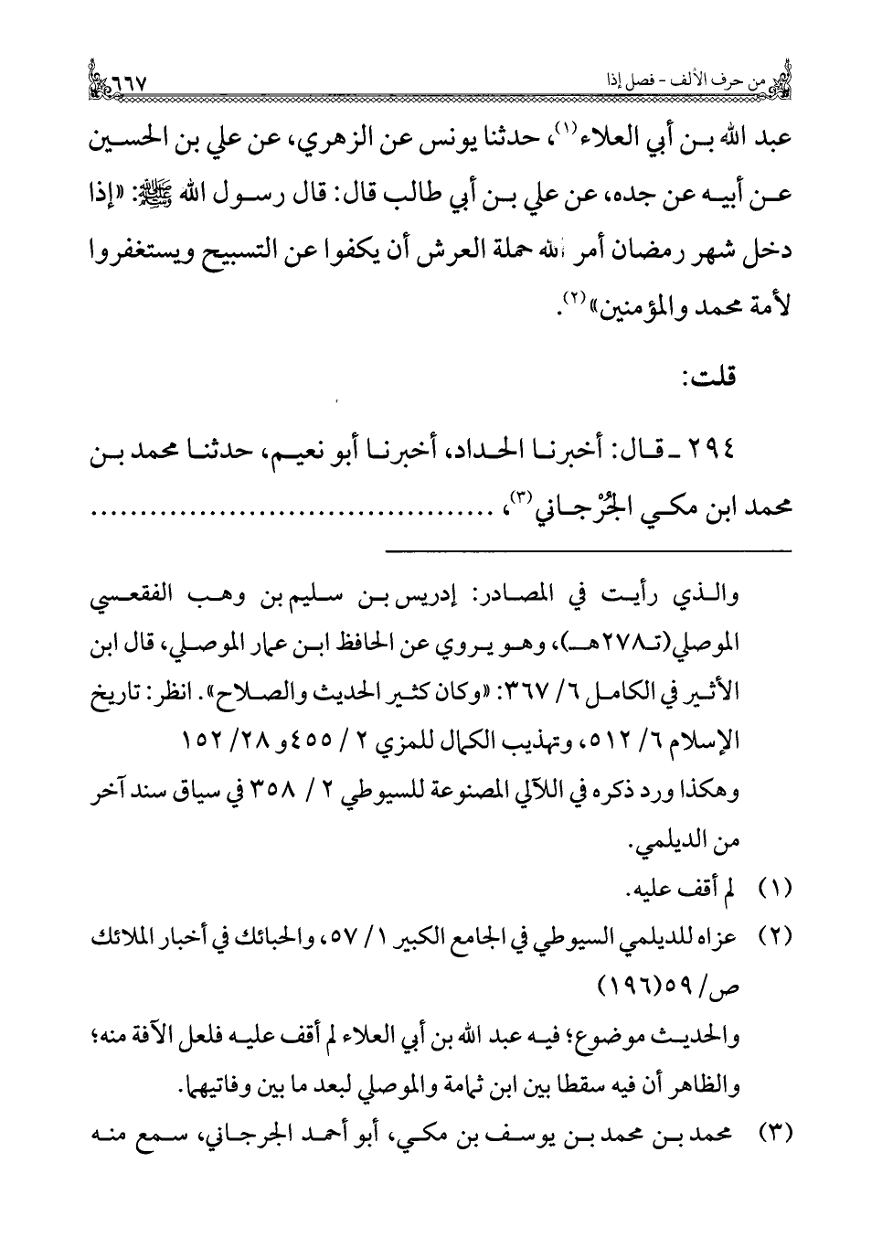 عبد الله بن أبي العلاء (¬١)، حدثنا يونس عن الزهري، عن علي بن الحسين عن أبيه عن جده، عن علي بن أبي طالب قال: قال رسول الله - صلى الله عليه وسلم -: "إذا دخل شهر رمضان أمر الله حملة العرش أن يكفوا عن التسبيح ويستغفروا لأمة محمد والمؤمنين" (¬٢).