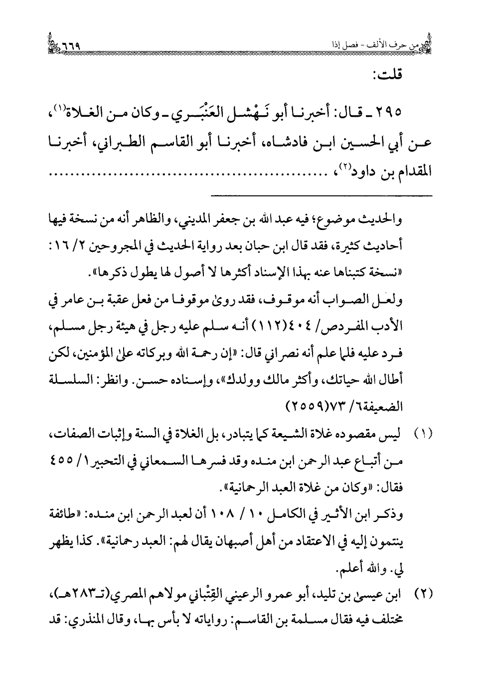 (¬١) ليس مقصوده غلاة الشيعة كما يتبادر، بل الغلاة في السنة وإثبات الصفات، من أتباع عبد الرحمن ابن منده وقد فسرها السمعاني في التحبير ١/ ٤٥٥ فقال: "وكان من غلاة العبد الرحمانية".