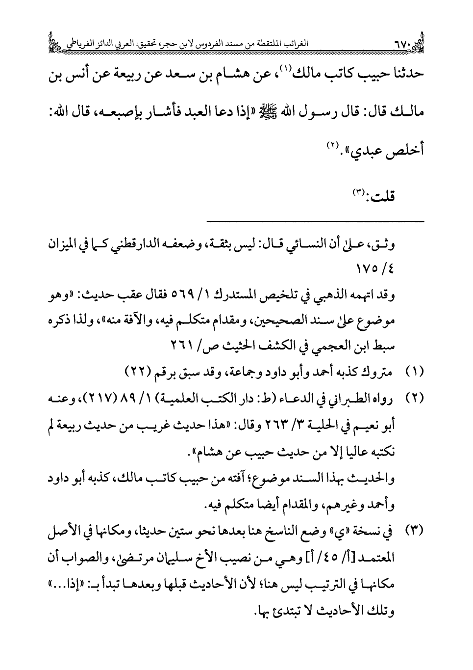 (¬٢) رواه الطبراني في الدعاء (ط: دار الكتب العلمية) ١/ ٨٩ (٢١٧)، وعنه أبو نعيم في الحلية ٣/ ٢٦٣ وقال: "هذا حديث غريب من حديث ربيعة لم نكتبه عاليا إلا من حديث حبيب عن هشام".