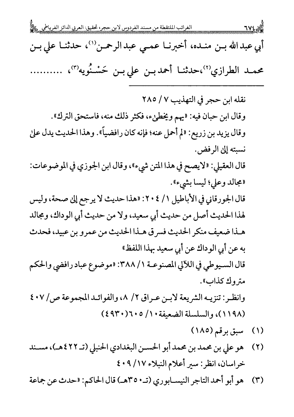 (¬٢) هو علي بن محمد بن محمد أبو الحسن البغدادي الحنبلي (ت ٤٢٢ هـ)، مسند خراسان، انظر: سير أعلام النبلاء ١٧/ ٤٠٩