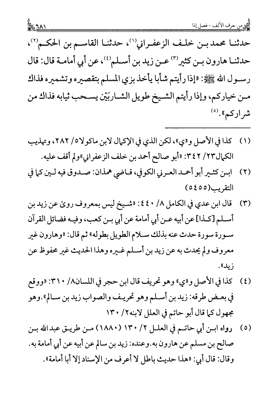 حدثنا محمد بن خلف الزعفراني (¬١)، حدثنا القاسم بن الحكم (¬٢)، حدثنا هارون بن كثير (¬٣) عن زيد بن أسلم (¬٤)، عن أبي أمامة قال: قال رسول الله: "إذا رأيتم شأبا يأخذ بزي المسلم بتقصيره وتشميره فذاك من خياركم، وإذا رأيتم الشيخ طويل الشاربَيْن يسحب ثيابه فذاك من شراركم". (¬٥)