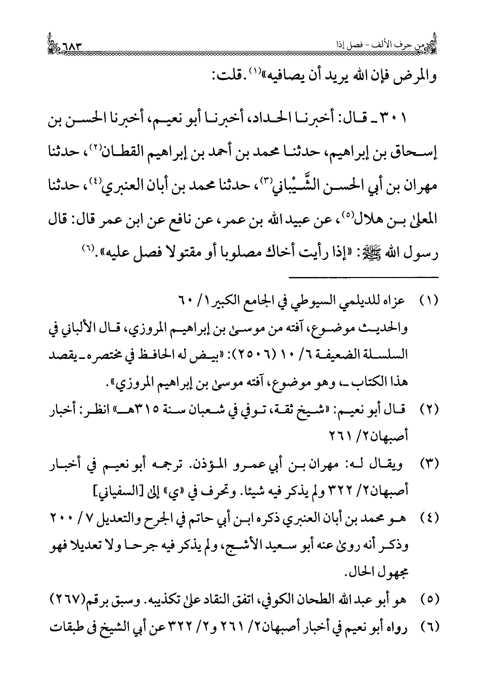 ٣٠١ - قال: أخبرنا الحداد، أخبرنا أبو نعيم، أخبرنا الحسن بن إسحاق بن إبراهيم، حدثنا محمد بن أحمد بن إبراهيم القطان (¬٢)، حدثنا مهران بن أبي الحسن الشَّيْباني (¬٣)، حدثنا محمد بن أبان العنبري (¬٤)، حدثنا المعلي بن هلال (¬٥)، عن عبيد الله بن عمر، عن نافع عن ابن عمر قال: قال رسول الله - صلى الله عليه وسلم -: "إذا رأيت أخاك مصلوبا أو مقتولا فصل عليه". (¬٦)