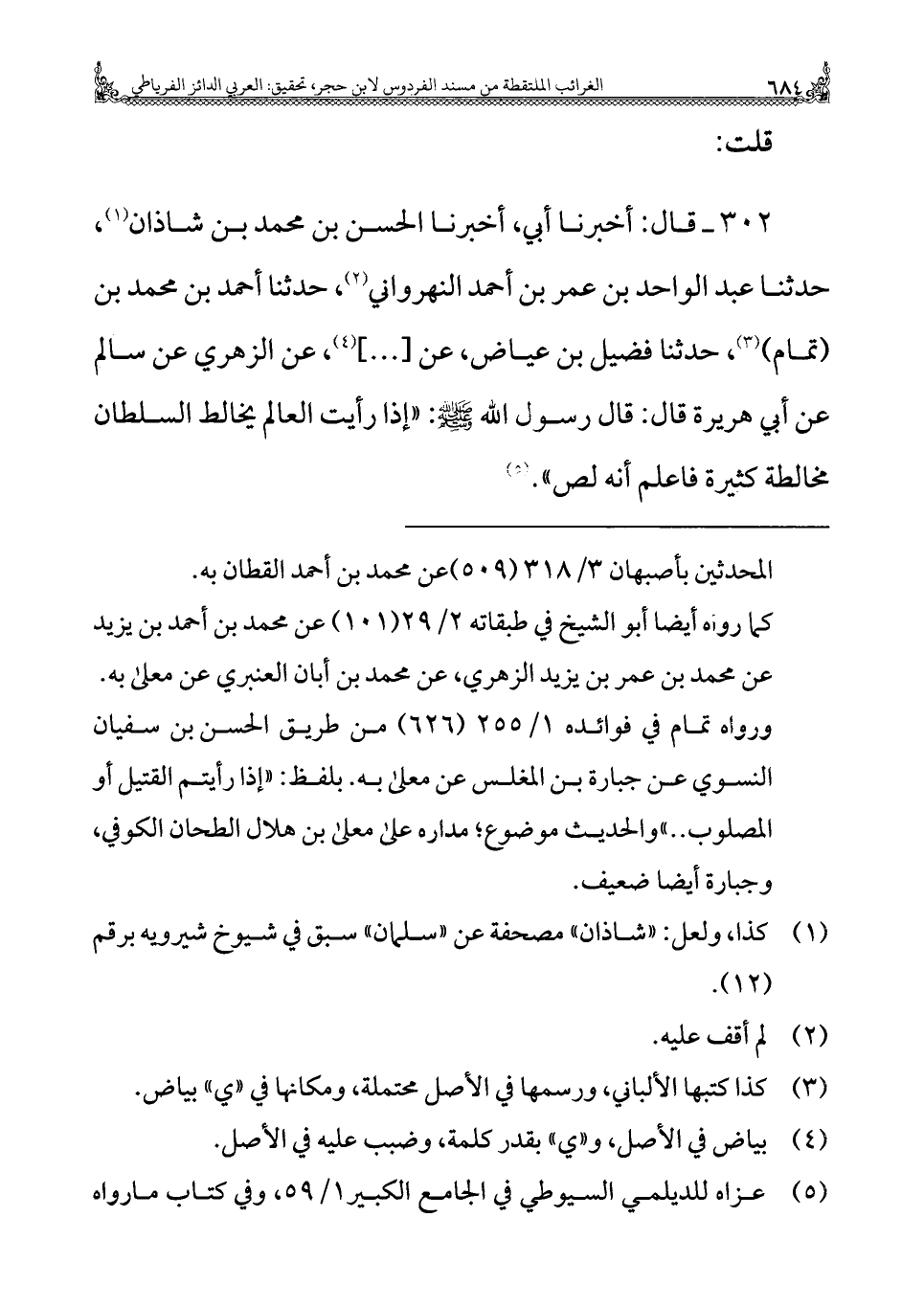 ٣٠٢ - قال: أخبرنا أبي، أخبرنا الحسن بن محمد بن شاذان (¬١)، حدثنا عبد الواحد بن عمر بن أحمد النهرواني (¬٢)، حدثنا أحمد بن محمد بن (تمام) (¬٣)، حدثنا فضيل بن عياض، عن [ ... ] (¬٤)، عن الزهري عن سالم عن أبي هريرة قال: قال رسول الله - صلى الله عليه وسلم -: "إذا رأيت العالم يخالط السلطان مخالطة كثيرة فأعلم أنه لص" (¬٥).
