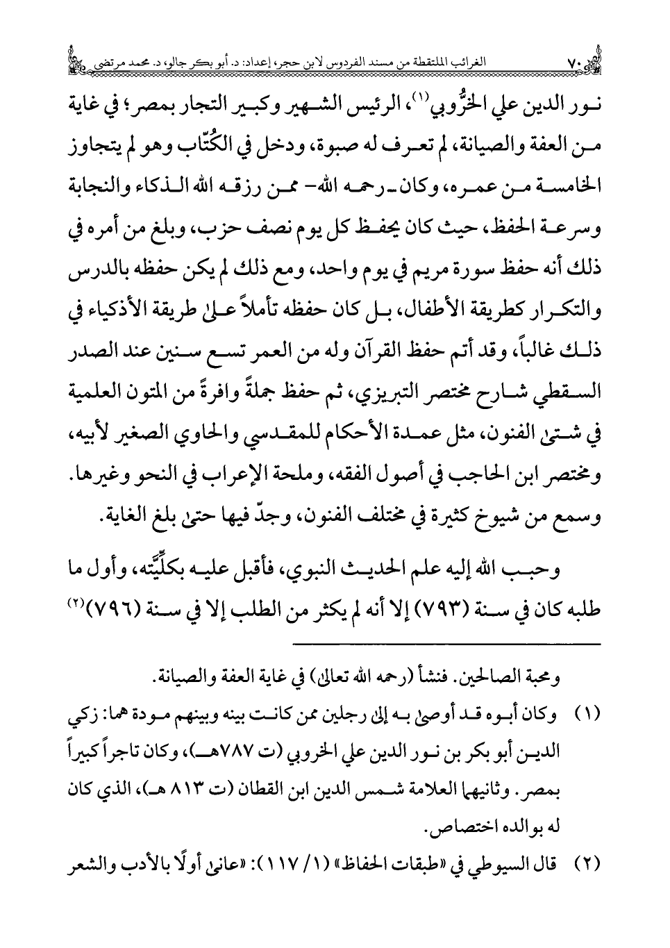 نور الدين علي الخرُّوبي (¬١)، الرئيس الشهير وكبير التجار بمصر؛ فِي غاية من العفة والصيانة، لم تعرف له صبوة، ودخل فِي الكُتّاب وهو لم يتجاوز الخامسة من عمره، وكان - رَحِمَهُ اللهُ - ممن رزقه الله الذكاء والنجابة وسرعة الحفظ، حيث كَانَ يحفظ كل يوم نصف حزب، وبلغ من أمره فِي ذلك أَنَّهُ حفظ سورة مريم فِي يوم واحد، ومع ذلك لم يكن حفظه بالدرس والتكرار كطريقة الأطفال، بل كَانَ حفظه تأملًا على طريقة الأذكياء فِي ذلك غالبًا، وقد أتم حفظ القرآن وله من العمر تسع سنين عند الصدر السقطي شارح مختصر التبريزي، ثم حفظ جُمْلَةً وافرةً من المتون العلمية فِي شتى الفنون، مثل عمدة الأحكام للمقدسي والحاوي الصغير لأبيه، ومختصر ابن الحاجب فِي أصول الفقه، وملحة الإعراب فِي النحو وغيرها. وسمع من شيوخ كثيرة فِي مختلف الفنون، وجدّ فيها حَتَّى بلغ الغاية.