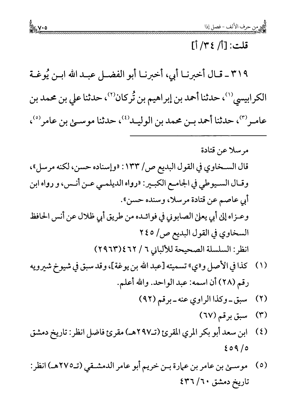 ٣١٩ - قال أخبرنا أبي، أخبرنا أبو الفضل عبد الله ابن يُوغة الكرابيسي (¬١)، حدثنا أحمد بن إبراهيم بن تُركان (¬٢)، حدثنا علي بن محمد بن عامر (¬٣)، حدثنا أحمد بن محمد بن الوليد (¬٤)، حدثنا موسى بن عامر (¬٥)،