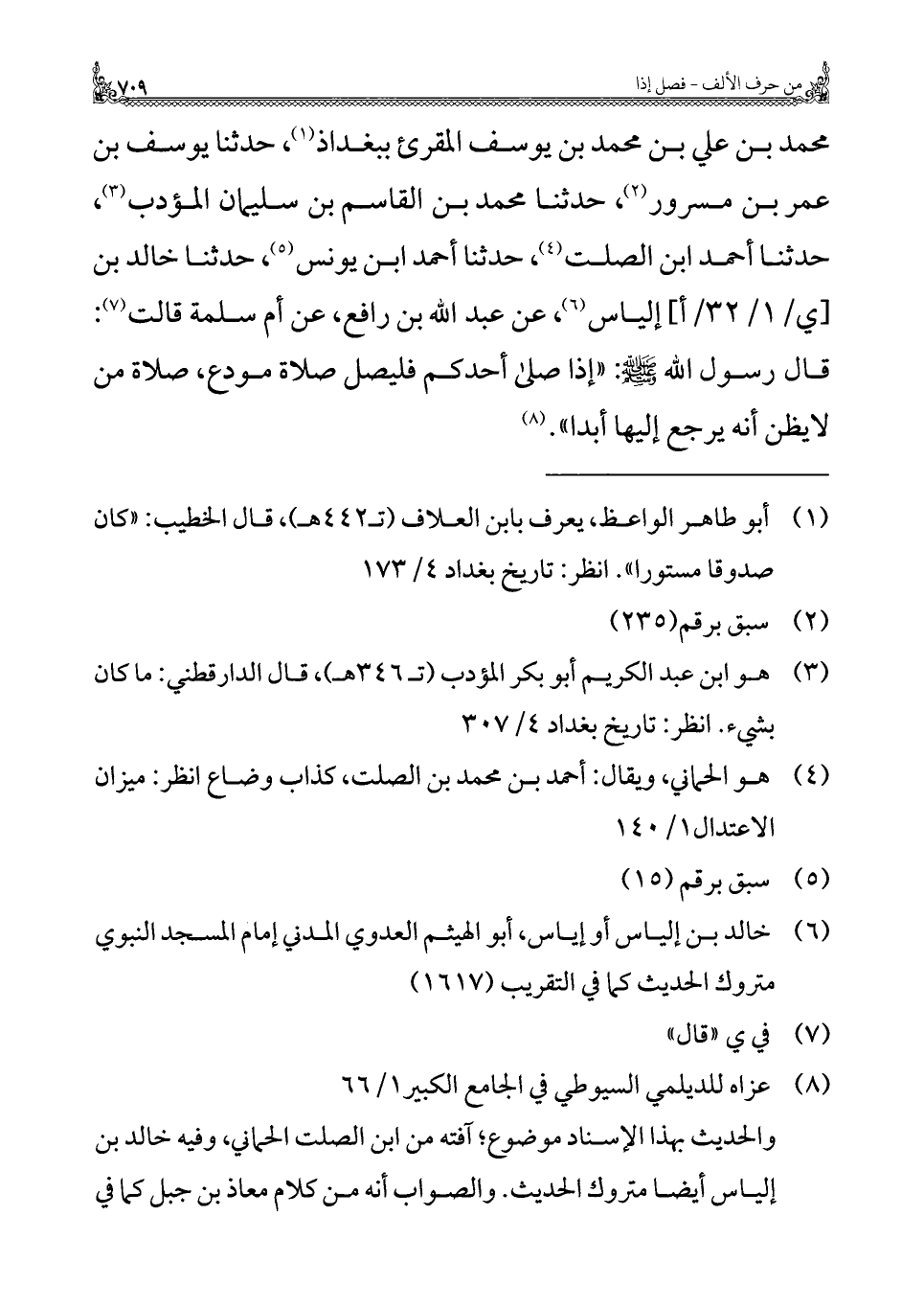 محمد بن علي بن محمد بن يوسف المقرئ ببغداد (¬١)، حدثنا يوسف بن عمر بن مسرور (¬٢)، حدثنا محمد بن القاسم بن سليمان المؤدب (¬٣)، حدثنا أحمد ابن الصلت (¬٤)، حدثنا أحمد ابن يونس (¬٥)، حدثنا خالد بن [ي/ ١/ ٣٢/ أ] إلياس (¬٦)، عن عبد الله بن رافع، عن أم سلمة قالت (¬٧): قال رسول الله - صلى الله عليه وسلم -: "إذا صلى أحدكم فليصل صلاة مودع، صلاة من لا يظن أنه يرجع إليها أبدا". (¬٨)