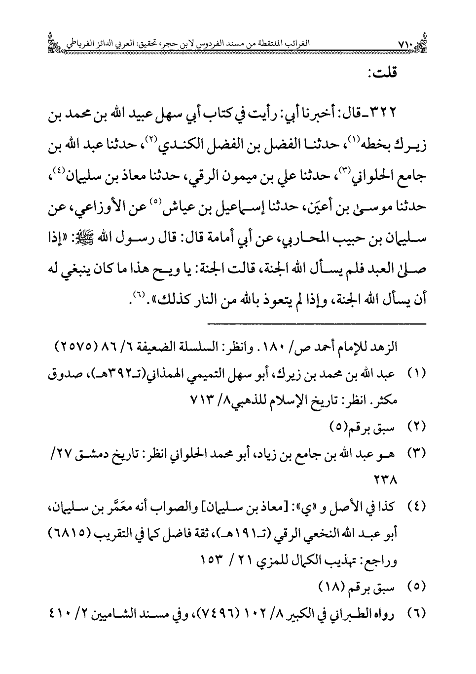 ٣٢٢ - قال: أخبرنا أبي: رأيت في كتاب أبي سهل عبيد الله بن محمد بن زيرك بخطه (¬١)، حدثنا الفضل بن الفضل الكندي (¬٢)، حدثنا عبد الله بن جامع الحلواني (¬٣)، حدثنا علي بن ميمون الرقي، حدثنا معاذ بن سليمان (¬٤)، حدثنا موسى بن أعيَن، حدثنا إسماعيل بن عياش (¬٥) عن الأوزاعي، عن سليمان بن حبيب المحاربي، عن أبي أمامة قال: قال رسول الله - صلى الله عليه وسلم -: "إذا صلى العبد فلم يسأل الله الجنة، قالت الجنة: يا ويح هذا ما كان ينبغي له أن يسأل الله الجنة، وإذا لم يتعوذ بالله من النار كذلك". (¬٦).