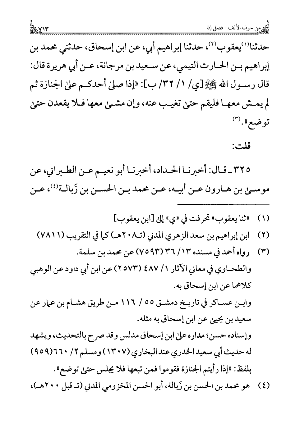 حدثنا (¬١) يعقوب (¬٢)، حدثنا إبراهيم أبي، عن ابن إسحاق، حدثني محمد بن إبراهيم بن الحارث التيمي، عن سعيد بن مرجانة، عن أبي هريرة قال: قال رسول الله - صلى الله عليه وسلم -[ي/ ١/ ٣٢/ ب]: "إذا صلى أحدكم على الجنازة ثم لم يمش معها فليقم حتى تغيب عنه، وإن مشى معها فلا يقعدن حتى توضع". (¬٣)