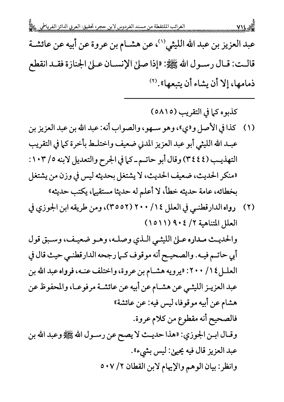 (¬١) كذا في الأصل و"ي"، وهو سهو، والصواب أنه: عبد الله بن عبد العزيز بن عبد الله الليثي أبو عبد العزيز المدني ضعيف واختلط بأخرة كما في التقريب التهذيب (٣٤٤٤) وقال أبو حاتم - كما في الجرح والتعديل لابنه ٥/ ١٠٣: "منكر الحديث، ضعيف الحديث، لا يشتغل بحديثه ليس في وزن من يشتغل بخطائه، عامة حديثه خطأ، لا أعلم له حديثا مستقيما، يكتب حديثه".
