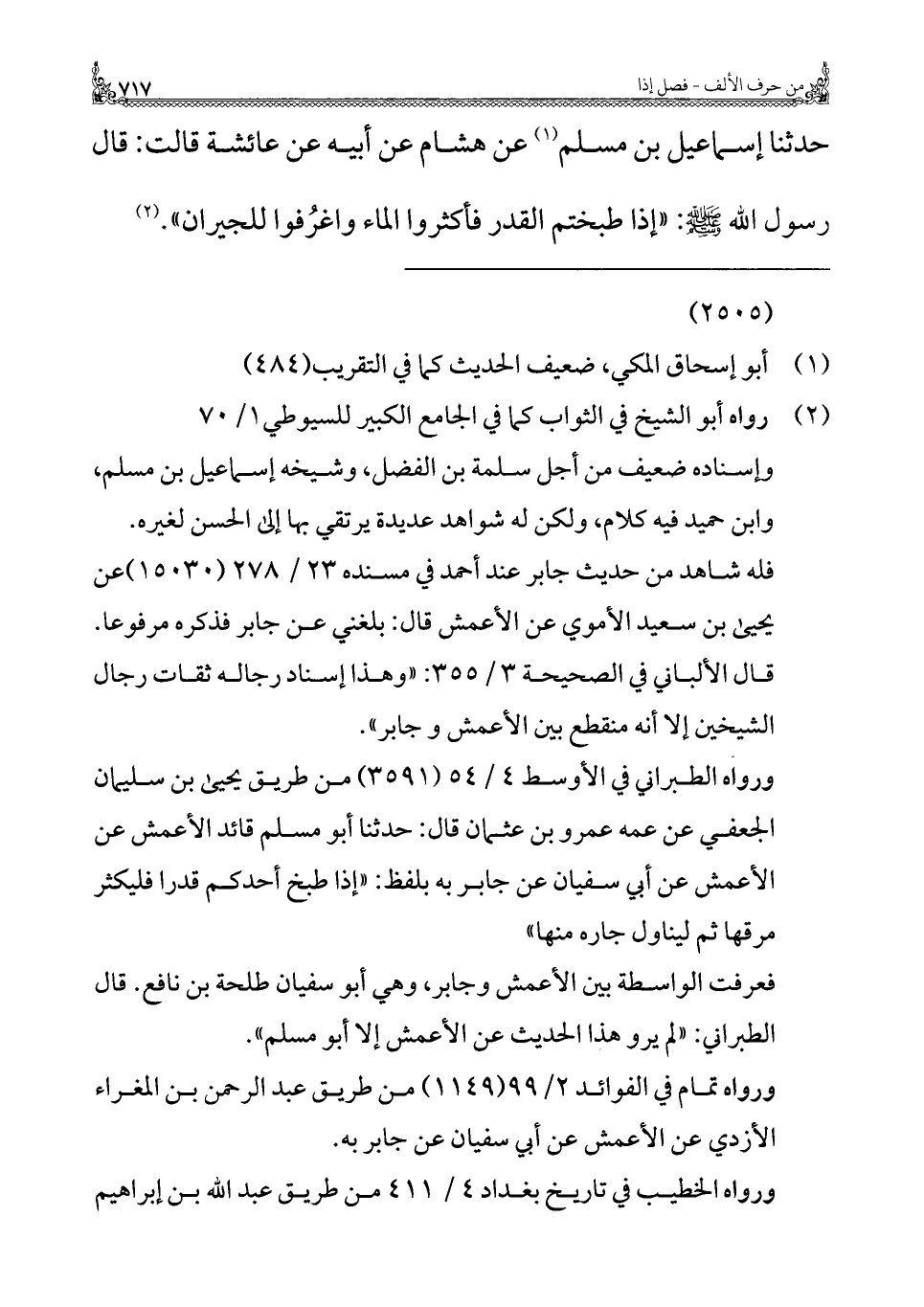 ورواه الطبراني في الأوسط ٤/ ٥٤ (٣٥٩١) من طريق يحيى بن سليمان الجعفي عن عمه عمرو بن عثمان قال: حدثنا أبو مسلم قائد الأعمش عن الأعمش عن أبي سفيان عن جابر به بلفظ: "إذا طبخ أحدكم قدرا فليكثر مرقها ثم ليناول جاره منها"