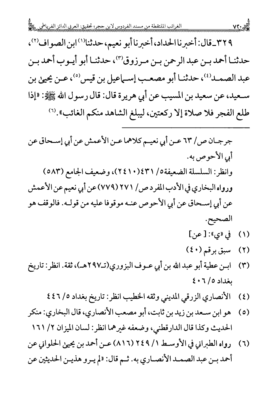 ٣٢٩ - قال: أخبرنا الحداد، أخبرنا أبو نعيم، حدثنا (¬١) ابن الصواف (¬٢)، حدثنا أحمد بن عبد الرحمن بن مرزوق (¬٣)، حدثنا أبو أيوب أحمد بن عبد الصمد (¬٤)، حدثنا أبو مصعب إسماعيل بن قيس (¬٥)، عن يحيى بن سعيد، عن سعيد بن المسيب عن أبي هريرة قال: قال رسول الله - صلى الله عليه وسلم -: "إذا طلع الفجر فلا صلاة إلا ركعتين، ليبلغ الشاهد منكم الغائب". (¬٦)