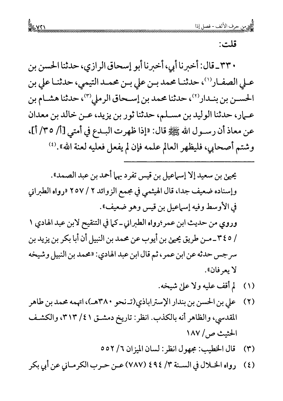 ٣٣٠ - قال: أخبرنا أبي، أخبرنا أبو إسحاق الرازي، حدثنا الحسن بن علي الصفار (¬١)، حدثنا محمد بن علي بن محمد التيمي، حدثنا علي بن الحسن بن بندار (¬٢)، حدثنا محمد بن إسحاق الرملي (¬٣)، حدثنا هشام بن عمار، حدثنا الوليد بن مسلم، حدثنا ثور بن يزيد، عن خالد بن معدان عن معاذ أن رسول الله - صلى الله عليه وسلم - قال: "إذا ظهرت البدع في أمتي [أ/ ٣٥/ أ]، وشتم أصحابي، فليظهر العالم علمه فإن لم يفعل فعليه لعنة الله". (¬٤)