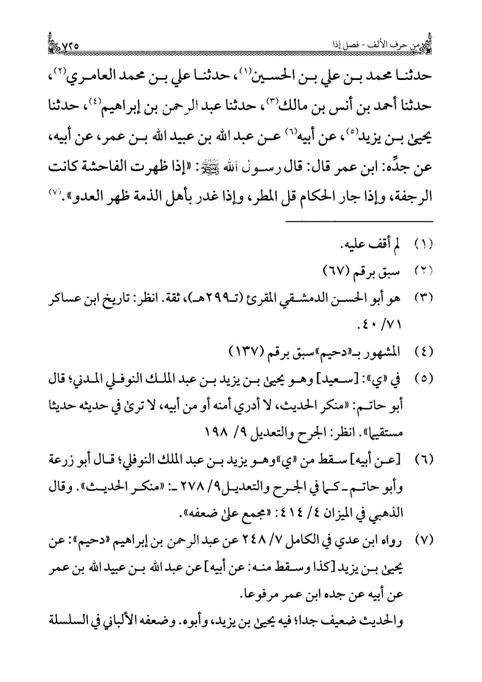 (¬٧) رواه ابن عدي في الكامل ٧/ ٢٤٨ عن عبد الرحمن بن إبراهيم "دحيم": عن يحيى بن يزيد [كذا وسقط منه: عن أبيه] عن عبد الله بن عبيد الله بن عمر عن أبيه عن جده ابن عمر مرفوعا.