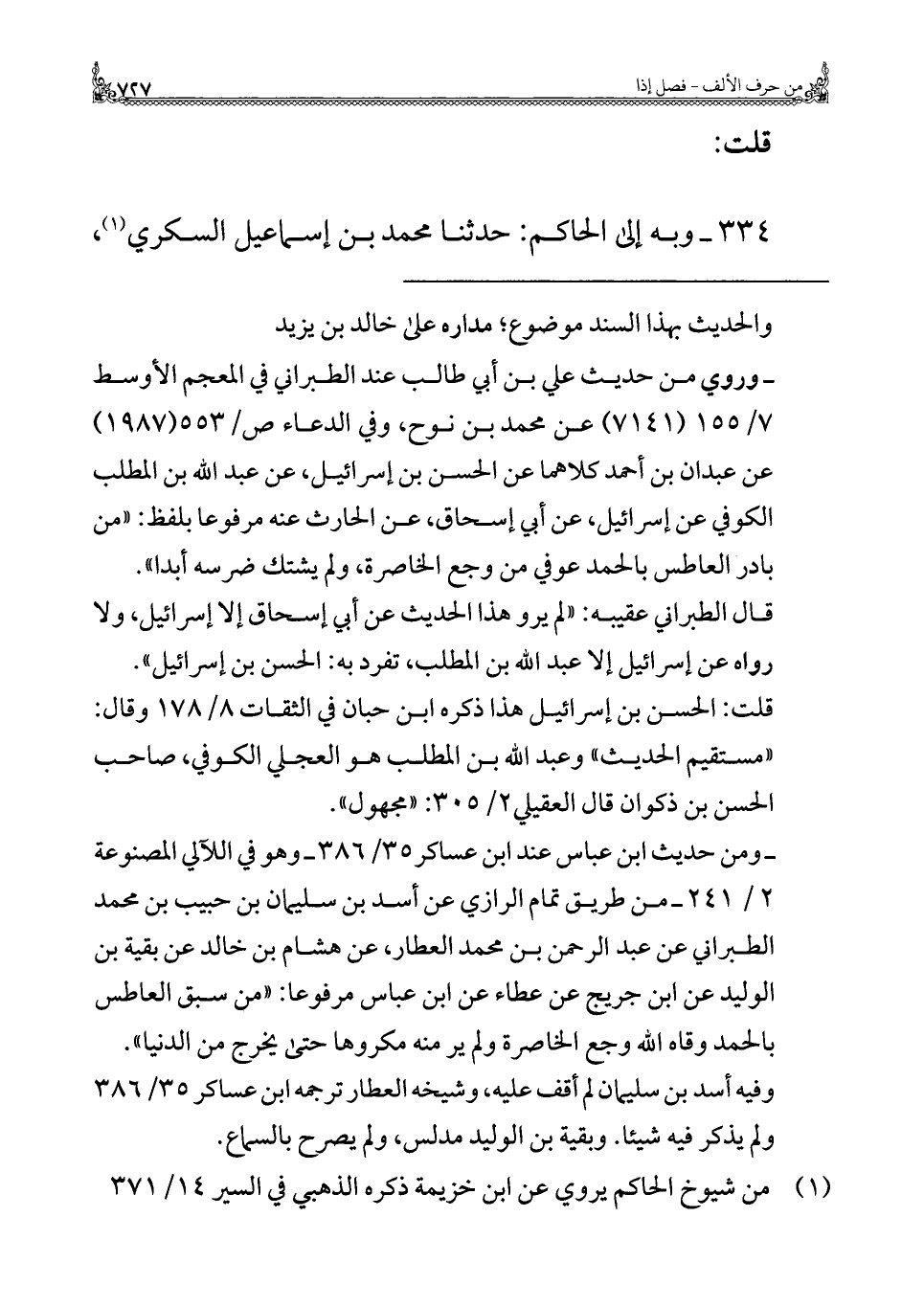 - وروي من حديث علي بن أبي طالب عند الطبراني في المعجم الأوسط ٧/ ١٥٥ (٧١٤١) عن محمد بن نوح، وفي الدعاء ص / ٥٥٣ (١٩٨٧) عن عبدان بن أحمد كلاهما عن الحسن بن إسرائيل، عن عبد الله بن المطلب الكوفي عن إسرائيل، عن أبي إسحاق، عن الحارث عنه مرفوعا بلفظ: "من بادر العاطس بالحمد عوفي من وجع الخاصرة، ولم يشتك ضرسه أبدا".