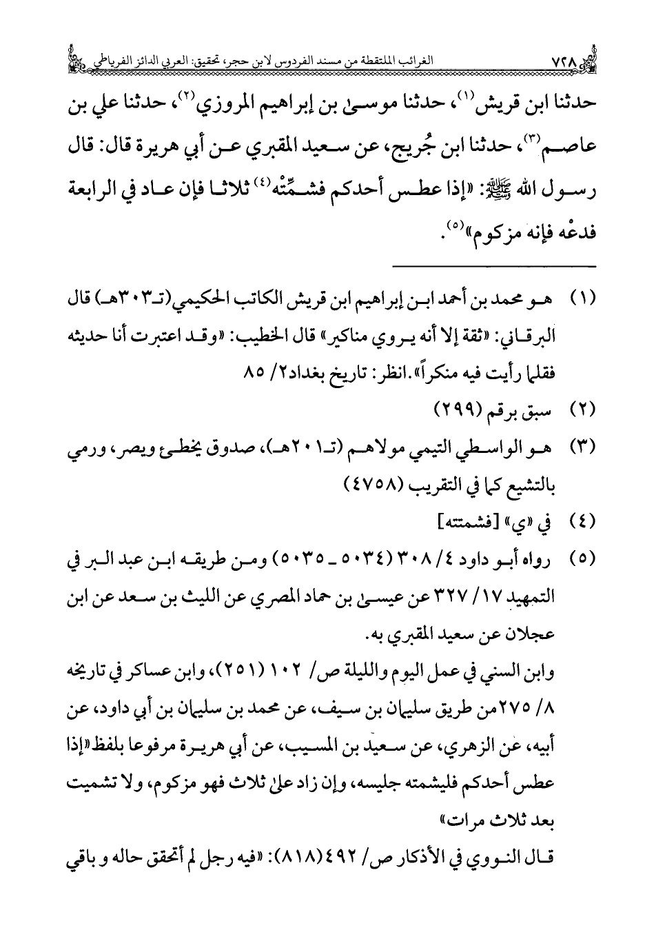 حدثنا ابن قريش (¬١)، حدثنا موسى بن إبراهيم المروزي (¬٢)، حدثنا علي بن عاصم (¬٣)، حدثنا ابن جُريج، عن سعيد المقبري عن أبي هريرة قال: قال رسول الله - صلى الله عليه وسلم -: "إذا عطس أحدكم فشمِّتْه (¬٤) ثلاثا فإن عاد في الرابعة فدعْه فإنه مزكوم" (¬٥).