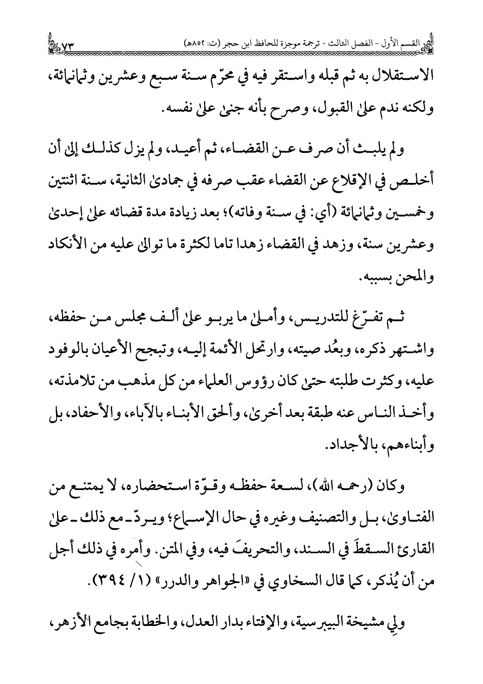 ولم يلبث أن صرف عن القضاء، ثم أعيد، ولم يزل كذلك إِلَى أن أخلص فِي الإقلاع عن القضاء عقب صرفه فِي جمادى الثانية، سنة اثنتين وخمسين وثمانمائة (أي: فِي سنة وفاته)؛ بعد زيادة مدة قضائه على إحدى وعشرين سنة، وزهد فِي القضاء زهدًا تًاما لكثرة ما توالى عليه من الأنكاد والمحن بسببه.