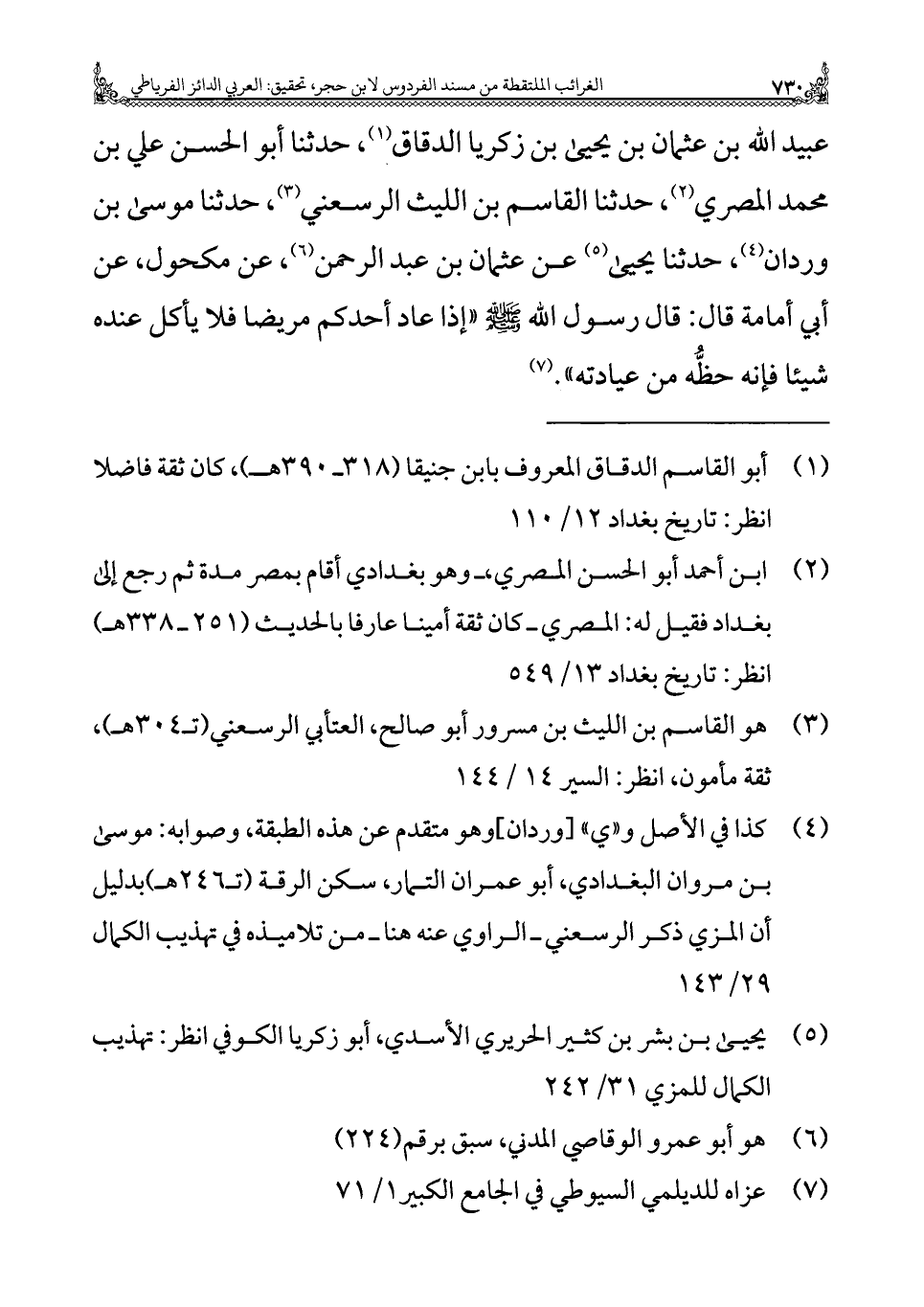 عبيد الله بن عثمان بن يحيى بن زكريا الدقاق (¬١)، حدثنا أبو الحسن علي بن محمد المصري (¬٢)، حدثنا القاسم بن الليث الرسعني (¬٣)، حدثنا موسى بن وردان (¬٤)، حدثنا يحيى (¬٥) عن عثمان بن عبد الرحمن (¬٦)، عن مكحول، عن أبي أمامة قال: قال رسول الله - صلى الله عليه وسلم - "إذا عاد أحدكم مريضا فلا يأكل عنده شيئا فإنه حظُّه من عيادته". (¬٧)