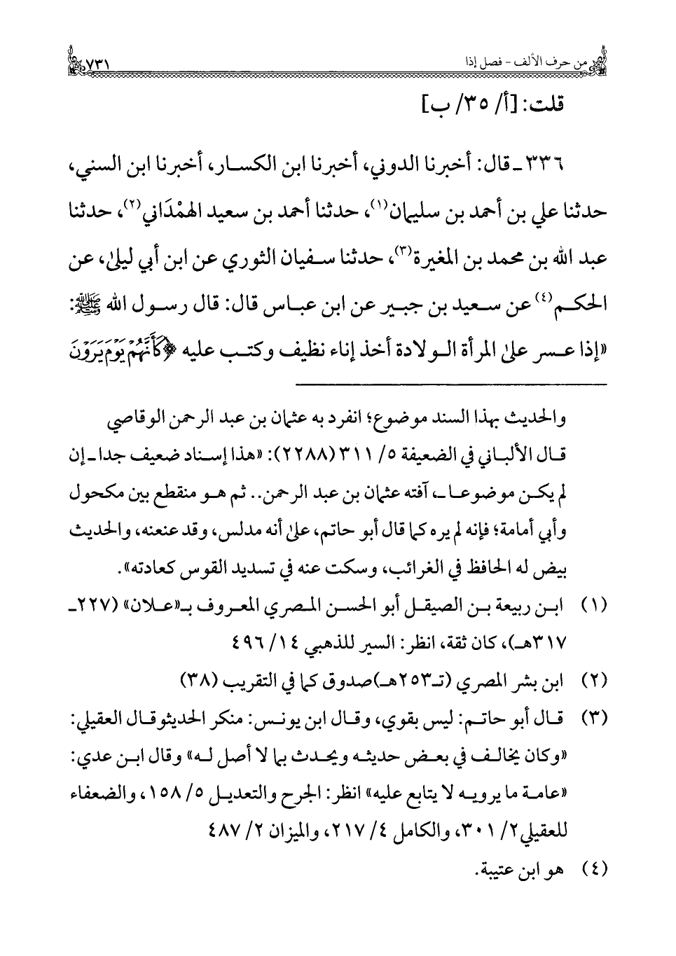 ٣٣٦ - قال: أخبرنا الدوني، أخبرنا ابن الكسار، أخبرنا ابن السني، حدثنا علي بن أحمد بن سليمان (¬١)، حدثنا أحمد بن سعيد الهمْدَاني (¬٢)، حدثنا عبد الله بن محمد بن المغيرة (¬٣)، حدثنا سفيان الثوري عن ابن أبي ليلى، عن الحكم (¬٤) عن سعيد بن جبير عن ابن عباس قال: قال رسول الله - صلى الله عليه وسلم -: "إذا عسر على المرأة الولادة أخذ إناء نظيف وكتب عليه {كَأَنَّهُمْ يَوْمَ يَرَوْنَ