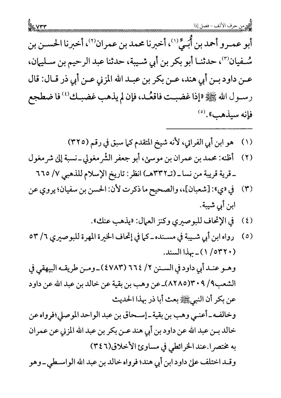 أبو عمرو أحمد بن أُبَيٍّ (¬١)، أخبرنا محمد بن عمران (¬٢)، أخبرنا الحسن بن سُفيان (¬٣)، حدثنا أبو بكر بن أبي شيبة، حدثنا عبد الرحيم بن سليمان، عن داود بن أبي هند، عن بكر بن عبد الله المزني عن أبي ذر قال: قال رسول الله - صلى الله عليه وسلم - "إذا غضبت فاقعُد، فإن لم يذهب غضبك (¬٤) فاضطجع فإنه سيذهب". (¬٥)