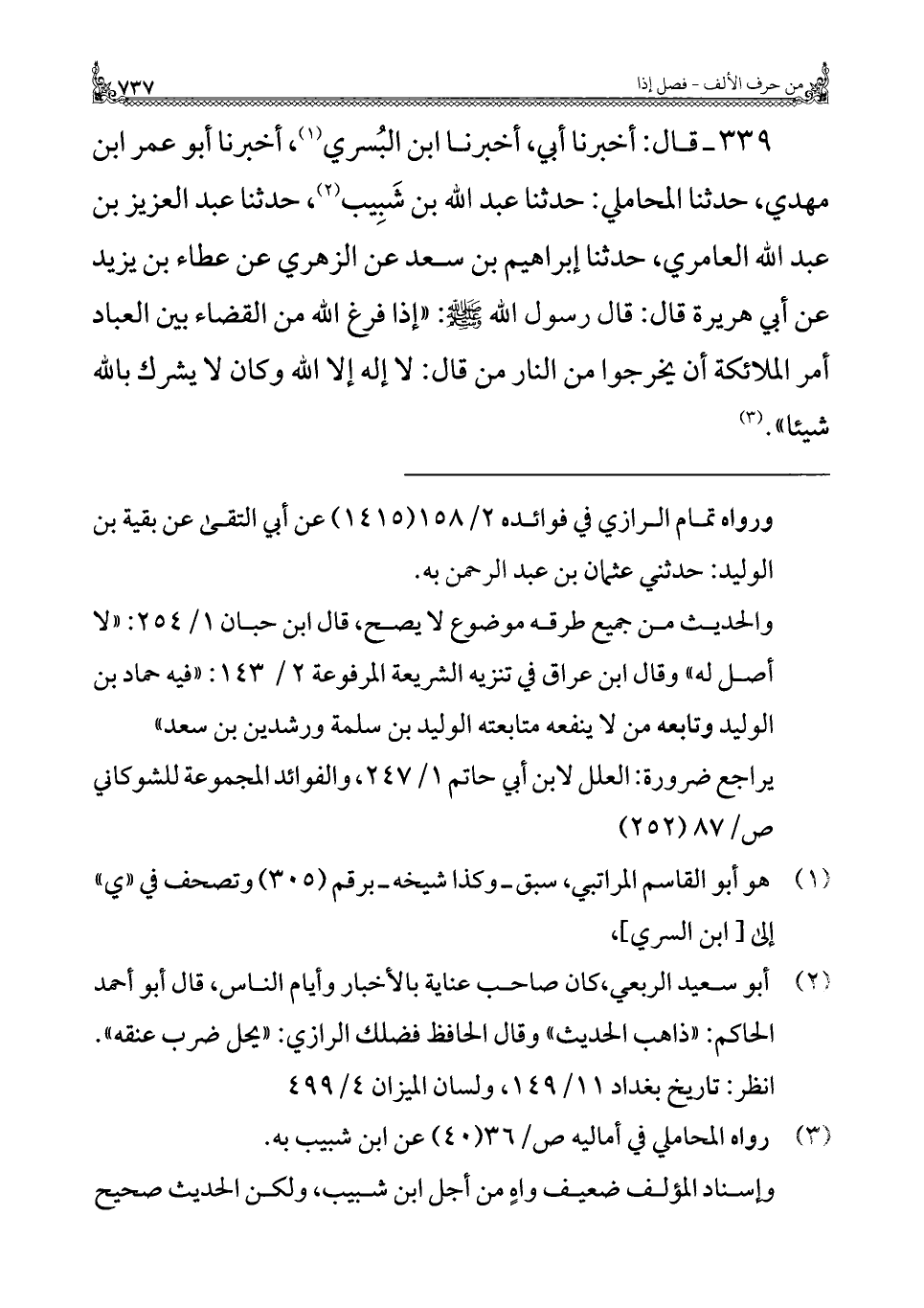 ٣٣٩ - قال: أخبرنا أبي، أخبرنا ابن البُسري (¬١)، أخبرنا أبو عمر ابن مهدي، حدثنا المحاملي: حدثنا عبد الله بن شَبِيب (¬٢)، حدثنا عبد العزيز بن عبد الله العامري، حدثنا إبراهيم بن سعد عن الزهري عن عطاء بن يزيد عن أبي هريرة قال: قال رسول الله - صلى الله عليه وسلم -: "إذا فرغ الله من القضاء بين العباد أمر الملائكة أن يخرجوا من النار من قال: لا إله إلا الله وكان لا يشرك بالله شيئا". (¬٣)