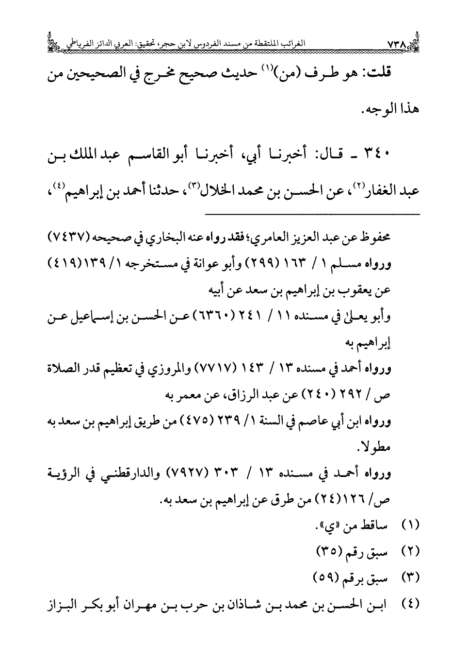 ٣٤٠ - قال: أخبرنا أبي، أخبرنا أبو القاسم عبد الملك بن عبد الغفار (¬٢)، عن الحسن بن محمد الخلال (¬٣)، حدثنا أحمد بن إبراهيم (¬٤)،