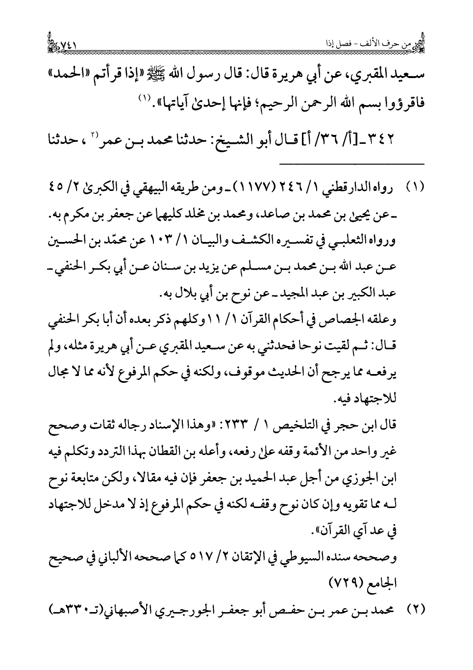 سعيد المقبري، عن أبي هريرة قال: قال رسول الله - صلى الله عليه وسلم - "إذا قرأتم "الحمد" فاقرؤوا بِسْمِ اللَّهِ الرَّحْمَنِ الرَّحِيمِ، فإنها إحدى آياتها". (¬١)
