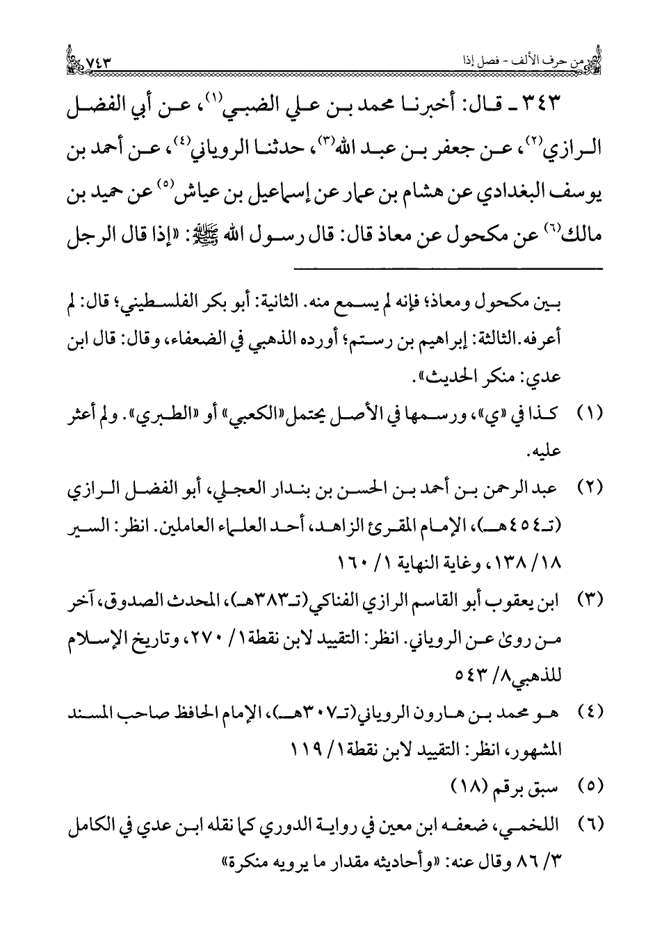 ٣٤٣ - قال: أخبرنا محمد بن علي الضبي (¬١)، عن أبي الفضل الرازي (¬٢)، عن جعفر بن عبد الله (¬٣)، حدثنا الروياني (¬٤)، عن أحمد بن يوسف البغدادي عن هشام بن عمار عن إسماعيل بن عياش (¬٥) عن حميد بن مالك (¬٦) عن مكحول عن معاذ قال: قال رسول الله - صلى الله عليه وسلم -: "إذا قال الرجل