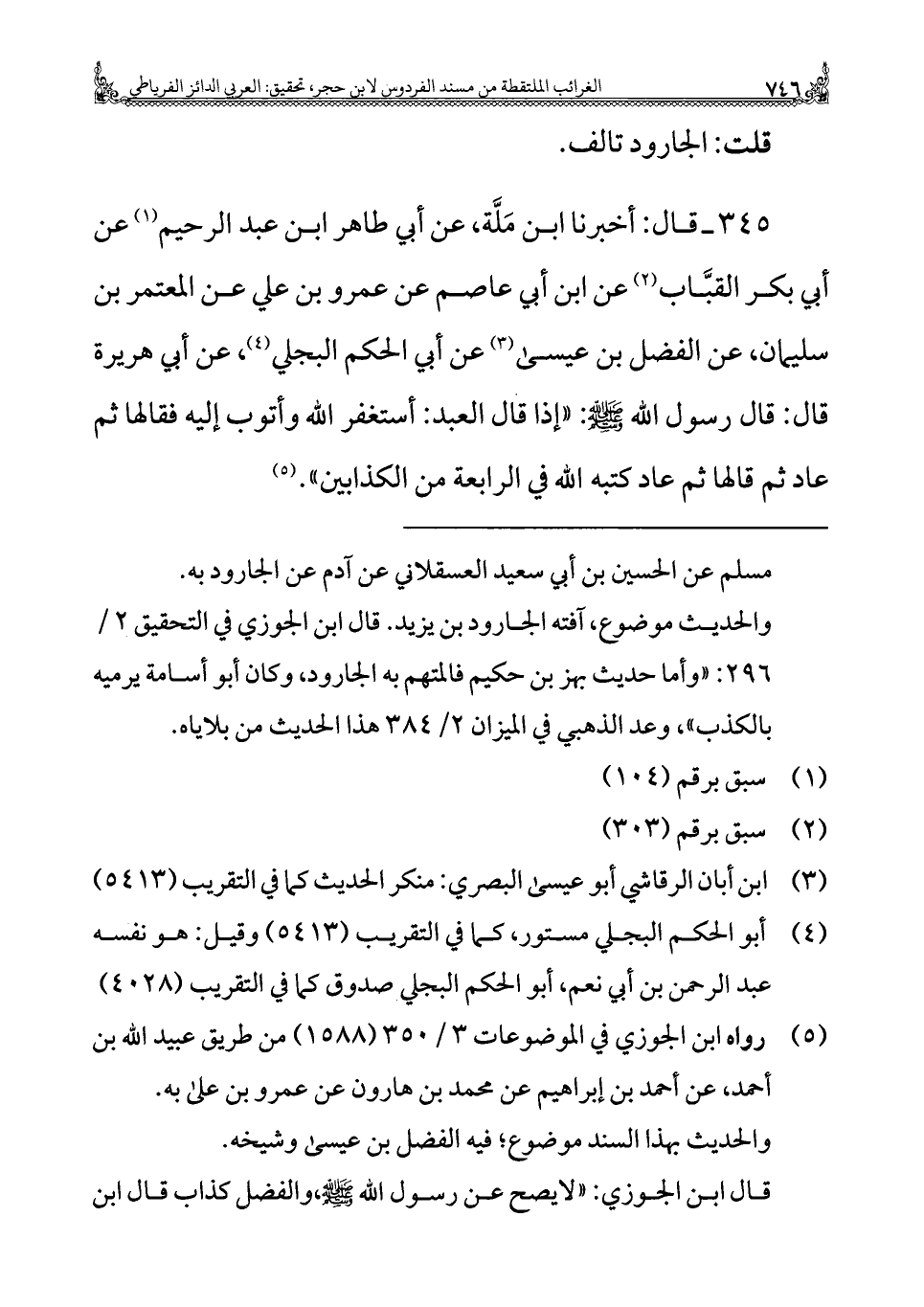 ٣٤٥ - قال: أخبرنا ابن مَلَّة، عن أبي طاهر ابن عبد الرحيم (¬١) عن أبي بكر القبَّاب (¬٢) عن ابن أبي عاصم عن عمرو بن علي عن المعتمر بن سليمان، عن الفضل بن عيسى (¬٣) عن أبي الحكم البجلي (¬٤)، عن أبي هريرة قال: قال رسول الله - صلى الله عليه وسلم -: "إذا قال العبد: أستغفر الله وأتوب إليه فقالها ثم عاد ثم قالها ثم عاد كتبه الله في الرابعة من الكذابين". (¬٥)