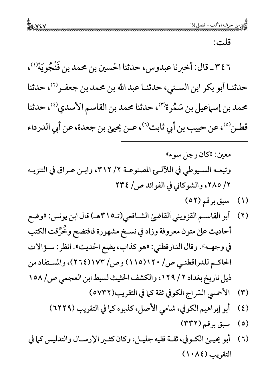 ٣٤٦ - قال: أخبرنا عبدوس، حدثنا الحسين بن محمد بن فَنْجُويَهْ (¬١)، حدثنا أبو بكر بن السني، حدثنا عبد الله بن محمد بن جعفر (¬٢)، حدثنا محمد بن إسماعيل بن سمُرة (¬٣)، حدثنا محمد بن القاسم الأسدي (¬٤)، حدثنا قطن (¬٥)، عن حبيب بن أبي ثابت (¬٦)، عن يحيى بن جعدة، عن أبي الدرداء