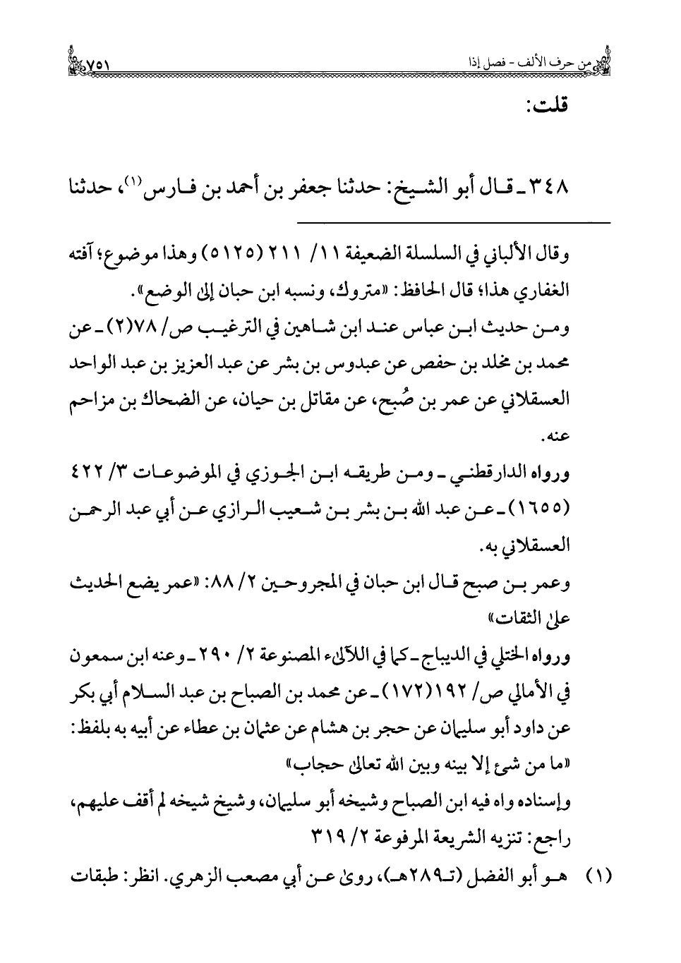 ٣٤٨ - قال أبو الشيخ: حدثنا جعفر بن أحمد بن فارس (¬١)، حدثنا