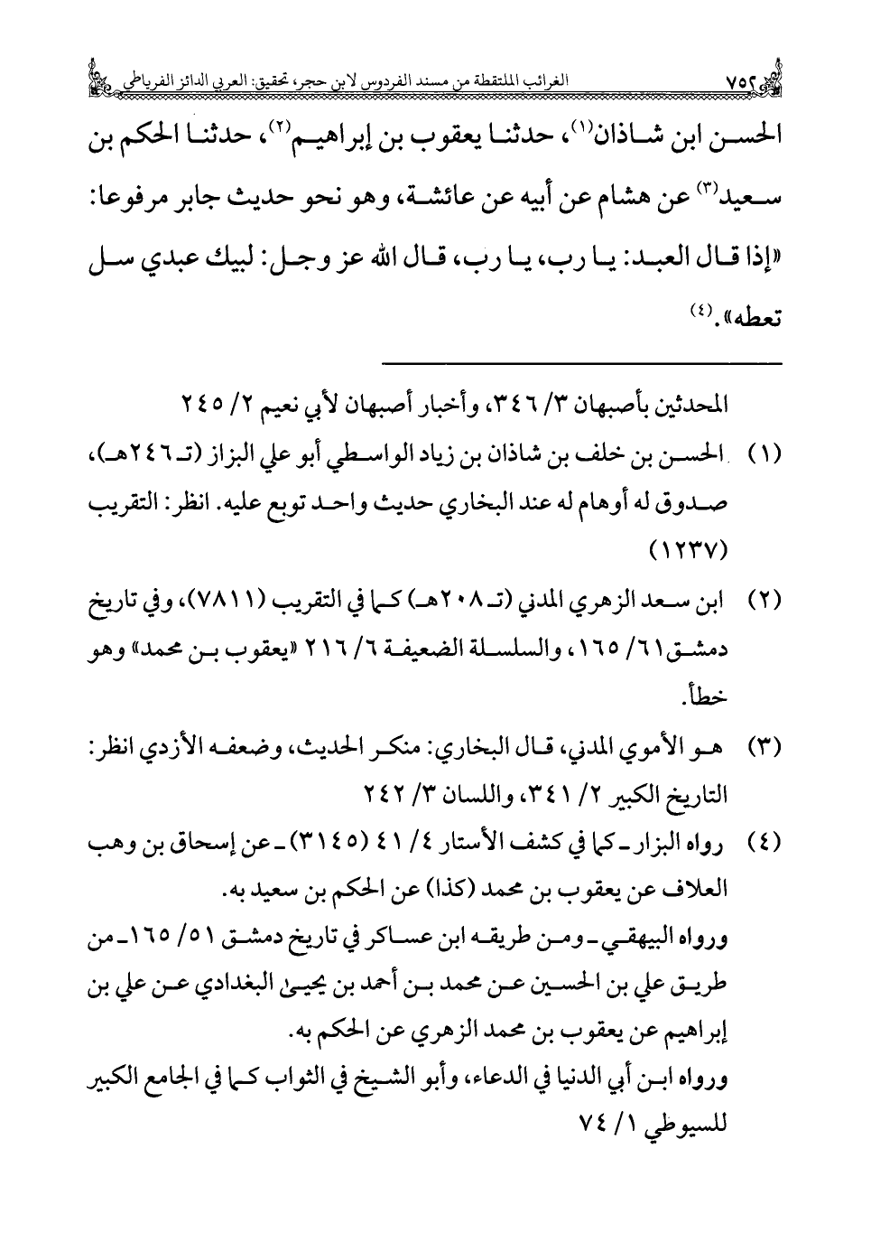 الحسن ابن شاذان (¬١)، حدثنا يعقوب بن إبراهيم (¬٢)، حدثنا الحكم بن سعيد (¬٣) عن هشام عن أبيه عن عائشة، وهو نحو حديث جابر مرفوعا: "إذا قال العبد: يا رب، يا رب، قال الله عز وجل: لبيك عبدي سل تعطه". (¬٤)