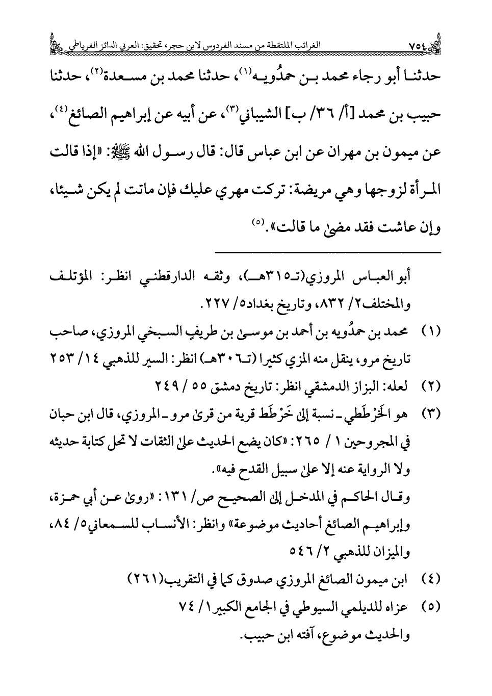 حدثنا أبو رجاء محمد بن حمدُويه (¬١)، حدثنا محمد بن مسعدة (¬٢)، حدثنا حبيب بن محمد [أ/ ٣٦/ ب] الشيباني (¬٣)، عن أبيه عن إبراهيم الصائغ (¬٤)، عن ميمون بن مهران عن ابن عباس قال: قال رسول الله - صلى الله عليه وسلم -: "إذا قالت المرأة لزوجها وهي مريضة: تركت مهري عليك فإن ماتت لم يكن شيئا، وإن عاشت فقد مضى ما قالت". (¬٥)