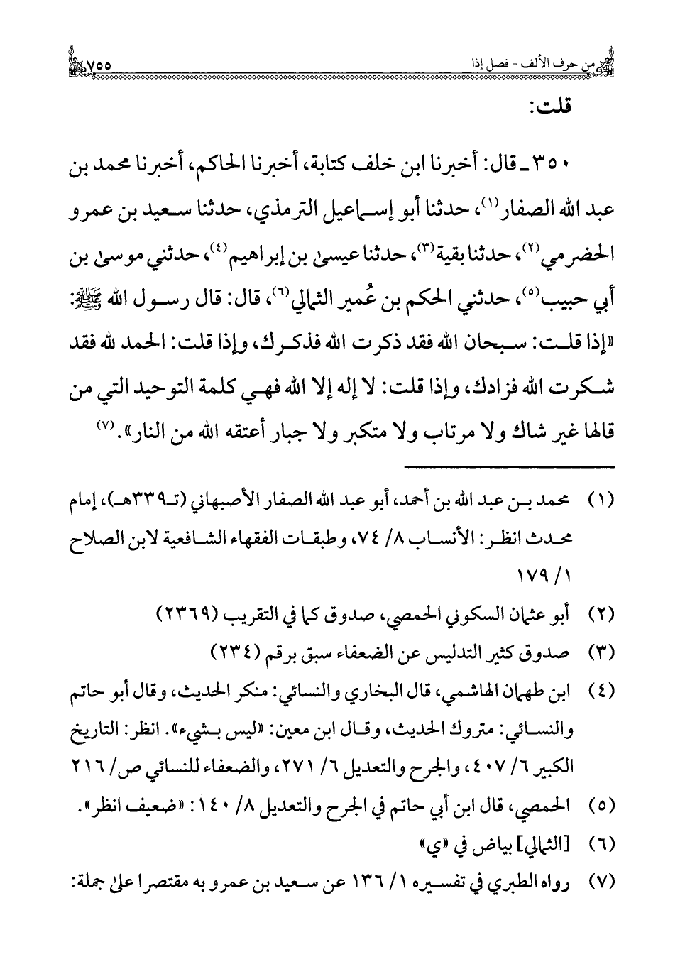 ٣٥٠ - قال: أخبرنا ابن خلف كتابة، أخبرنا الحاكم، أخبرنا محمد بن عبد الله الصفار (¬١)، حدثنا أبو إسماعيل الترمذي، حدثنا سعيد بن عمرو الحضرمي (¬٢)، حدثنا بقية (¬٣)، حدثنا عيسى بن إبراهيم (¬٤)، حدثني موسى بن أبي حبيب (¬٥)، حدثني الحكم بن عُمير الثمالي (¬٦)، قال: قال رسول الله - صلى الله عليه وسلم -: "إذا قلت: سبحان الله فقد ذكرت الله فذكرك، وإذا قلت: الحمد لله فقد شكرت الله فزادك، وإذا قلت: لا إله إلا الله فهي كلمة التوحيد التي من قالها غير شاك ولا مرتاب ولا متكبر ولا جبار أعتقه الله من النار". (¬٧)