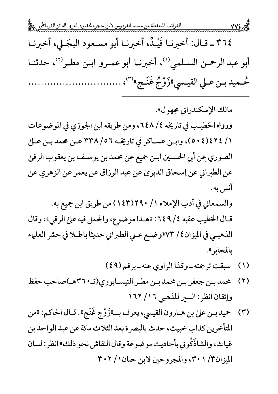 (¬٣) حميد بن علي بن هارون القيسي، يعرف ب "زَوْج غَنَج". قال الحاكم: "من المتأخرين كذاب خبيث، حدث بالبصرة بعد الثلاث مائة عن عبد الواحد بن غياث، والشاذَكُوني بأحاديث موضوعة وقال النقاش نحو ذلك" انظر: لسان الميزان ٣/ ٣٠١، والمجروحين لابن حبان ١/ ٣٠٢