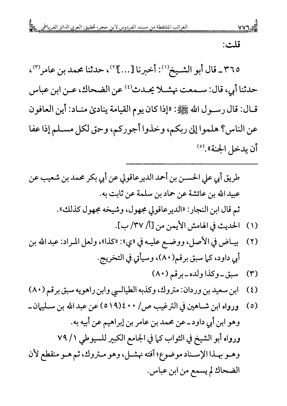 ٣٦٥ - قال أبو الشيخ (¬١): أخبرنا [ ... ] (¬٢)، حدثنا محمد بن عامر (¬٣)، حدثنا أبي، قال: سمعت نهشلا يحدث (¬٤) عن الضحاك، عن ابن عباس قال: قال رسول الله - صلى الله عليه وسلم -: "إذا كان يوم القيامة ينادى مناد: أين العافون عن الناس؟ هلموا إلى ربكم، وخذوا أجوركم، وحق لكل مسلم إذا عفا أن يدخل الجنة". (¬٥)