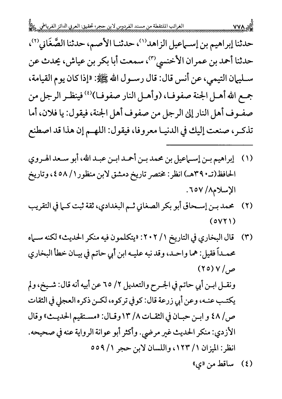 حدثنا إبراهيم بن إسماعيل الزاهد (¬١)، حدثنا الأصم، حدثنا الصَّغَاني (¬٢)، حدثنا أحمد بن عمران الأخنسي (¬٣)، سمعت أبا بكر بن عياش، يحدث عن سليمان التيمي، عن أنس قال: قال رسول الله - صلى الله عليه وسلم -: "إذا كان يوم القيامة، جمع الله أهل الجنة صفوفا، (وأهل النار صفوفا) (¬٤) فينظر الرجل من صفوف أهل النار إلى الرجل من صفوف أهل الجنة، فيقول: يا فلان، أما تذكر، صنعت إليك في الدنيا معروفا، فيقول: اللهم إن هذا قد اصطنع