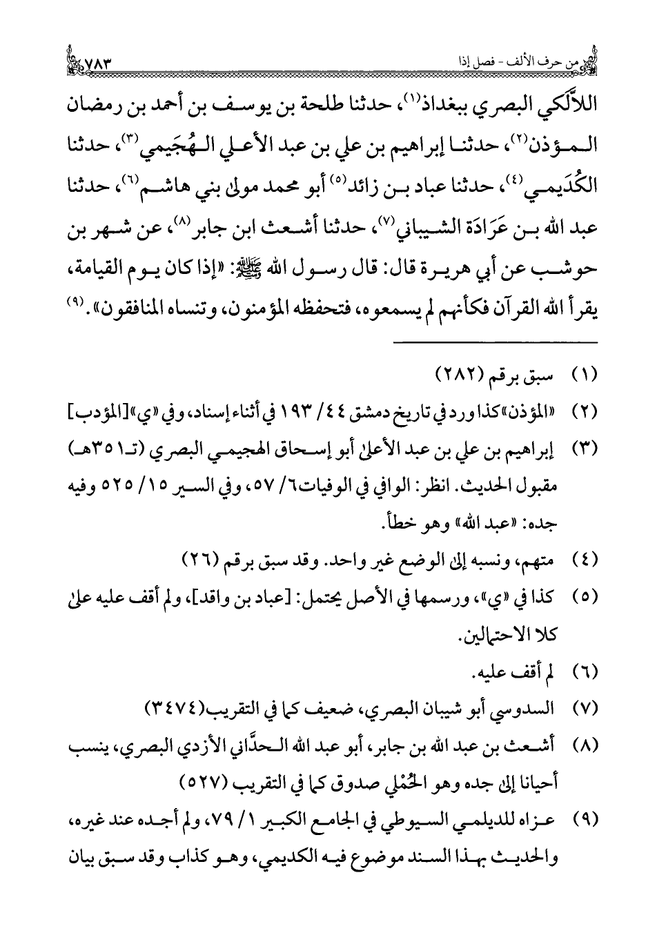 اللَّالكي البصري ببغداد (¬١)، حدثنا طلحة بن يوسف بن أحمد بن رمضان المؤذن (¬٢)، حدثنا إبراهيم بن علي بن عبد الأعلى الهُجَيمي (¬٣)، حدثنا الكُدَيمي (¬٤)، حدثنا عباد بن زائد (¬٥) أبو محمد مولى بني هاشم (¬٦)، حدثنا عبد الله بن عَرَادَة الشيباني (¬٧)، حدثنا أشعث ابن جابر (¬٨)، عن شهر بن حوشب عن أبي هريرة قال: قال رسول الله - صلى الله عليه وسلم -: "إذا كان يوم القيامة، يقرأ الله القرآن فكأنهم لم يسمعوه، فتحفظه المؤمنون، وتنساه المنافقون". (¬٩)