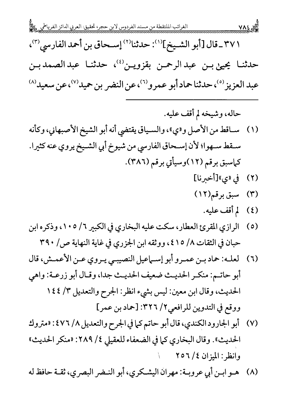 ٣٧١ - قال [أبو الشيخ] (¬١): حدثنا (¬٢) إسحاق بن أحمد الفارسي (¬٣)، حدثنا يحيى بن عبد الرحمن بقزوين (¬٤)، حدثنا عبد الصمد بن عبد العزيز (¬٥)، حدثنا حماد أبو عمرو (¬٦)، عن النضر بن حميد (¬٧)، عن سعيد (¬٨)
