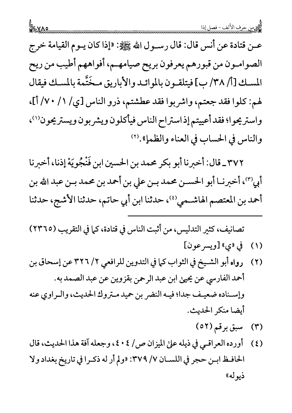 ٣٧٢ - قال: أخبرنا أبو بكر محمد بن الحسين ابن فَنْجُويَهْ إذنا، أخبرنا أبي (¬٣)، أخبرنا أبو الحسن محمد بن علي بن أحمد بن محمد بن عبد الله بن أحمد بن المعتصم الهاشمي (¬٤)، حدثنا ابن أبي حاتم، حدثنا الأشج، حدثنا