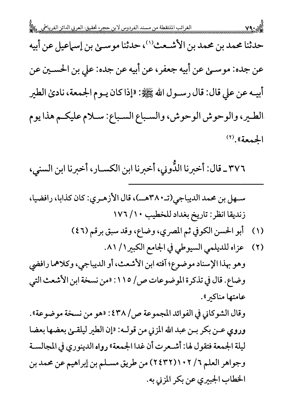 حدثنا محمد بن محمد بن الأشعث (¬١)، حدثنا موسى بن إسماعيل عن أبيه عن جده: موسى عن أبيه جعفر، عن أبيه عن جده: علي بن الحسين عن أبيه عن علي قال: قال رسول الله - صلى الله عليه وسلم -: "إذا كان يوم الجمعة، نادى الطير الطير، والوحوش الوحوش، والسباع السباع: سلام عليكم هذا يوم الجمعة". (¬٢)