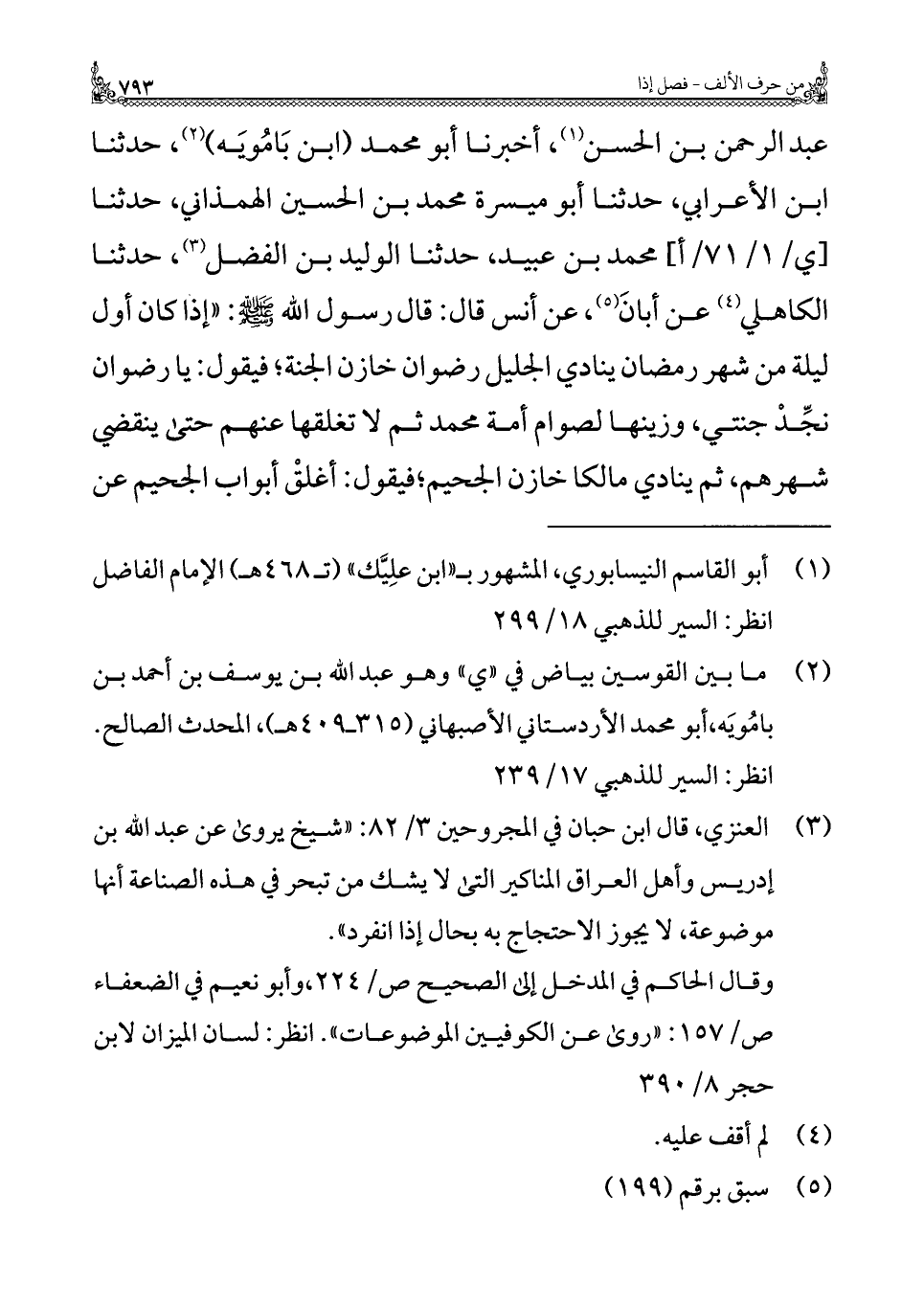 عبد الرحمن بن الحسن (¬١)، أخبرنا أبو محمد (ابن بَامُويَه) (¬٢)، حدثنا ابن الأعرابي، حدثنا أبو ميسرة محمد بن الحسين الهمذاني، حدثنا [ي/ ١/ ٧١/ أ] محمد بن عبيد، حدثنا الوليد بن الفضل (¬٣)، حدثنا الكاهلي (¬٤) عن أبانَ (¬٥)، عن أنس قال: قال رسول الله - صلى الله عليه وسلم -: "إذا كان أول ليلة من شهر رمضان ينادي الجليل رضوان خازن الجنة؛ فيقول: يا رضوان نجِّدْ جنتي، وزينها لصوام أمة محمد ثم لا تغلقها عنهم حتى ينقضي شهرهم، ثم ينادي مالكا خازن الجحيم؛ فيقول: أغلقْ أبواب الجحيم عن