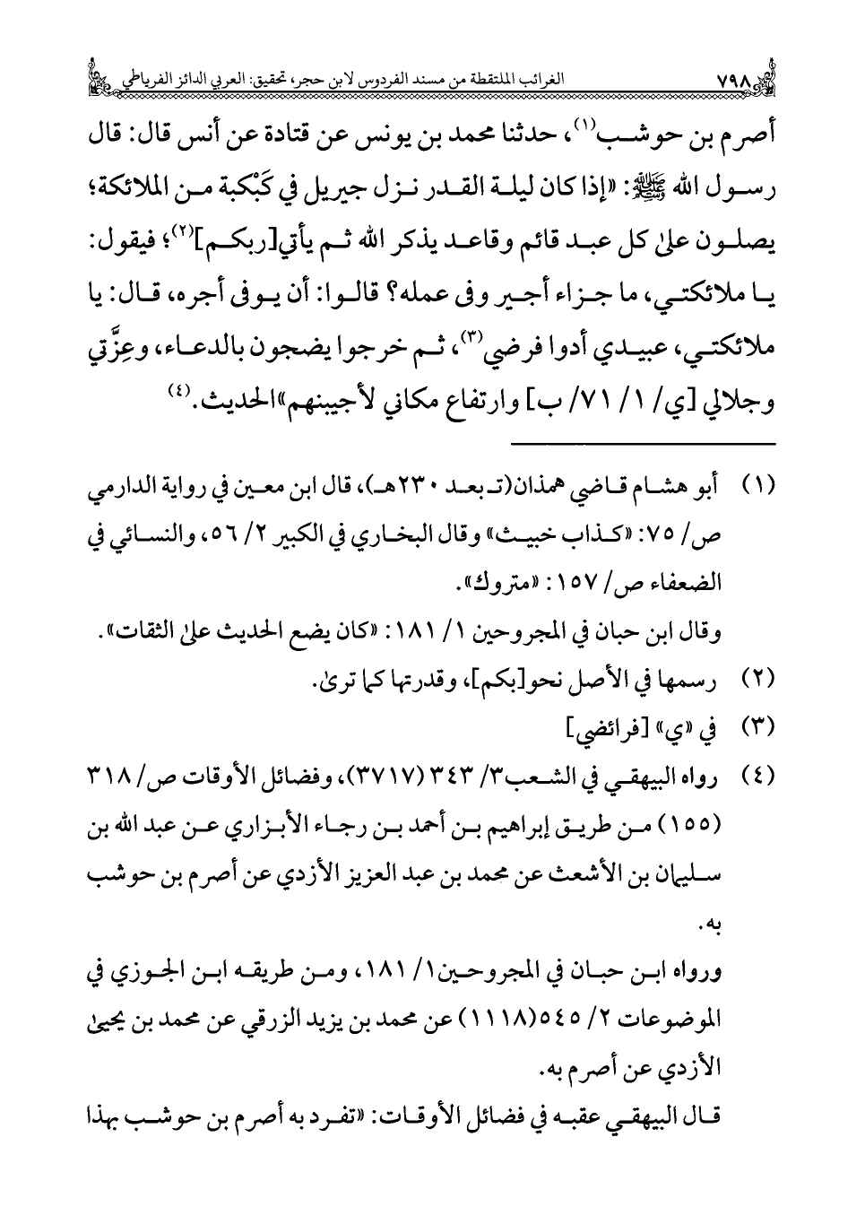 أصرم بن حوشب (¬١)، حدثنا محمد بن يونس عن قتادة عن أنس قال: قال رسول الله - صلى الله عليه وسلم -: "إذا كان ليلة القدر نزل جيريل في كَبْكبة من الملائكة؛ يصلون على كل عبد قائم وقاعد يذكر الله ثم يأتي [ربكم] (¬٢)؛ فيقول: يا ملائكتي، ما جزاء أجير وفي عمله؟ قالوا: أن يوفى أجره، قال: يا ملائكتي، عبيدي أدوا فرضي (¬٣)، ثم خرجوا يضجون بالدعاء، وعِزَّتي وجلالي [ي/ ١/ ٧١/ ب] وارتفاع مكاني لأجيبنهم" الحديث. (¬٤)