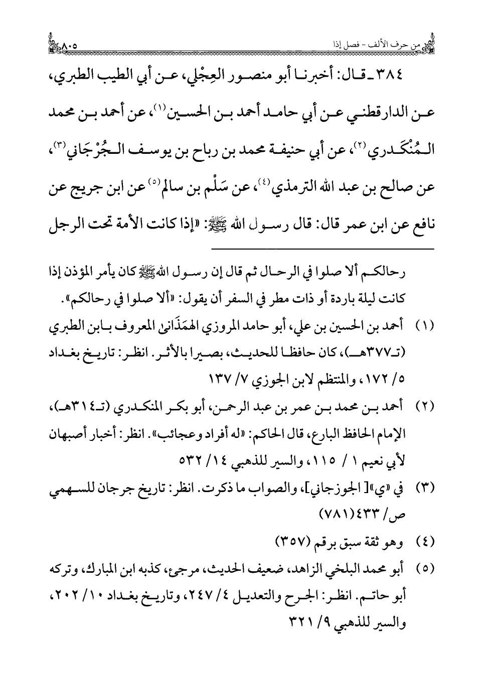٣٨٤ - قال: أخبرنا أبو منصور العِجْلي، عن أبي الطيب الطبري، عن الدارقطني عن أبي حامد أحمد بن الحسين (¬١)، عن أحمد بن محمد المُنْكَدري (¬٢)، عن أبي حنيفة محمد بن رباح بن يوسف الجُرْجَاني (¬٣)، عن صالح بن عبد الله الترمذي (¬٤)، عن سَلْم بن سالم (¬٥) عن ابن جريج عن نافع عن ابن عمر قال: قال رسول الله - صلى الله عليه وسلم -: "إذا كانت الأمة تحت الرجل