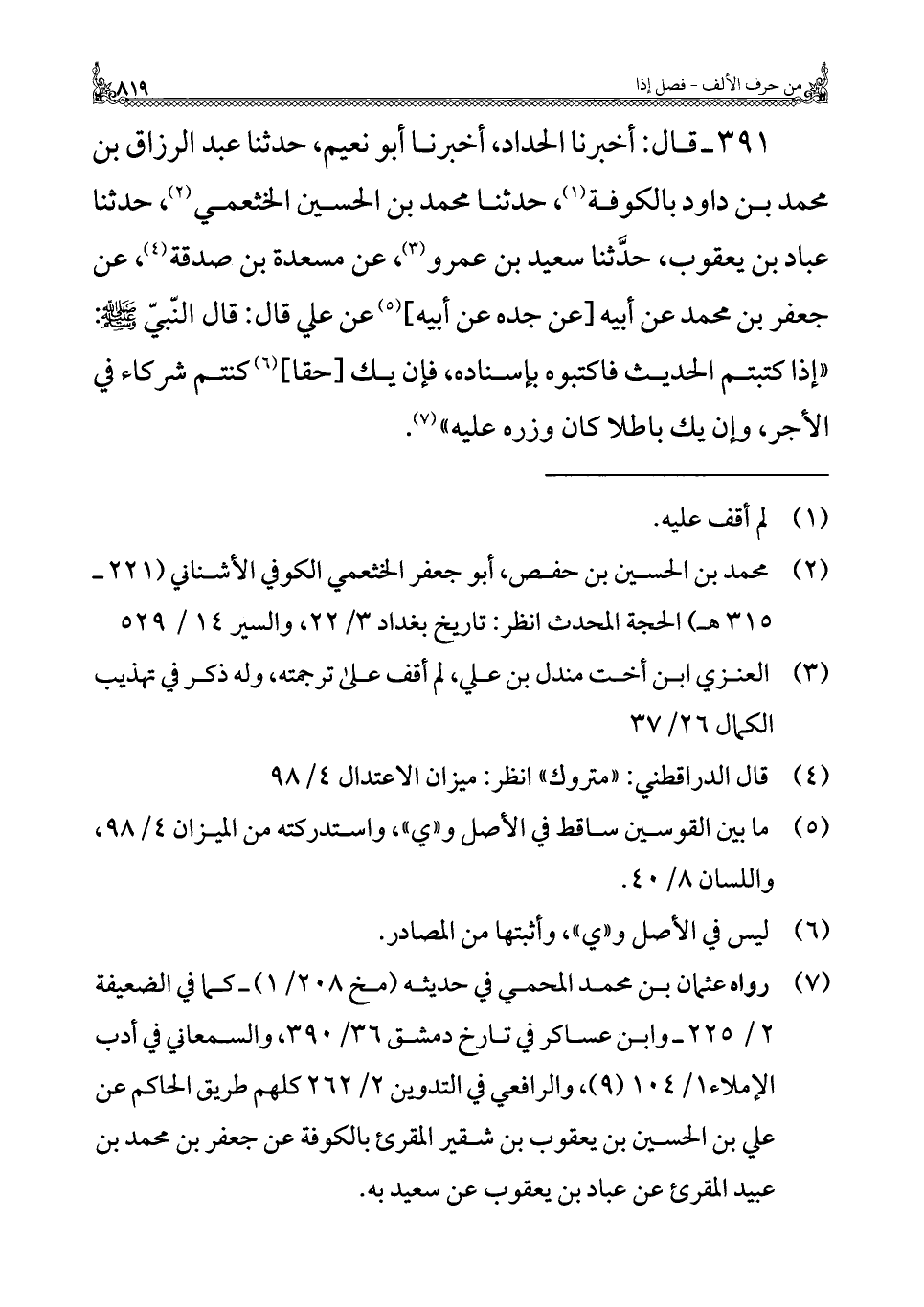 ٣٩١ - قال: أخبرنا الحداد، أخبرنا أبو نعيم، حدثنا عبد الرزاق بن محمد بن داود بالكوفة (¬١)، حدثنا محمد بن الحسين الخثعمي (¬٢)، حدثنا عباد بن يعقوب، حدَّثنا سعيد بن عمرو (¬٣)، عن مسعدة بن صدقة (¬٤)، عن جعفر بن محمد عن أبيه [عن جده عن أبيه] (¬٥) عن علي قال: قال النّبيّ - صلى الله عليه وسلم -: "إذا كتبتم الحديث فاكتبوه بإسناده، فإن يك [حقا] (¬٦) كنتم شركاء في الأجر، وإن يك باطلا كان وزره عليه" (¬٧).