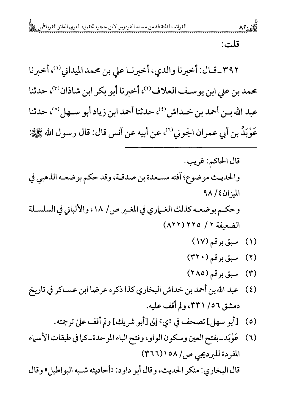 ٣٩٢ - قال: أخبرنا والدي، أخبرنا علي بن محمد الميداني (¬١)، أخبرنا محمد بن علي ابن يوسف العلاف (¬٢)، أخبرنا أبو بكر بن شاذان (¬٣)، حدثنا عبد الله بن أحمد بن خداش (¬٤)، حدثنا أحمد ابن زياد أبو سهل (¬٥)، حدثنا عَوْبَدُ بن أبي عمران الجوني (¬٦)، عن أبيه عن أنس قال: قال رسول الله - صلى الله عليه وسلم -: