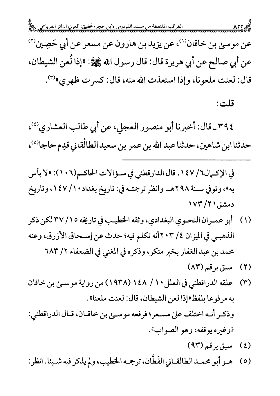 عن موسى بن خاقان (¬١)، عن يزيد بن هارون عن مسعر عن أبي حَصِين (¬٢) عن أبي صالح عن أبي هريرة قال: قال رسول الله - صلى الله عليه وسلم -: "إذا لُعن الشيطان، قال: لعنت ملعونا، وإذا استعذت الله منه، قال: كسرت ظهري" (¬٣).