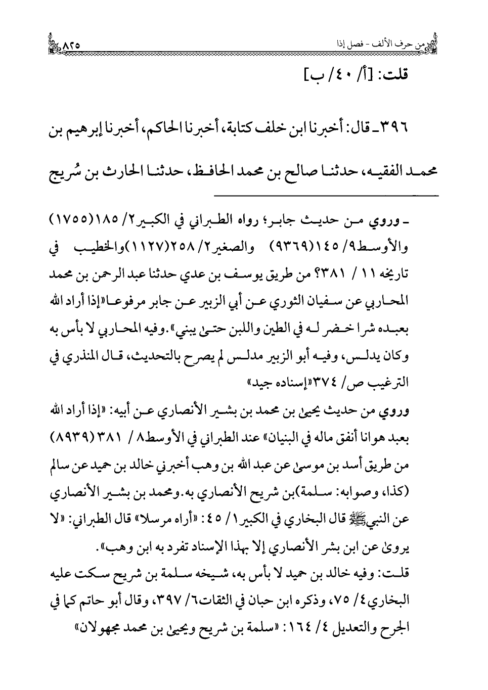 ٣٩٦ - قال: أخبرنا ابن خلف كتابة، أخبرنا الحاكم، أخبرنا إبرهيم بن محمد الفقيه، حدثنا صالح بن محمد الحافظ، حدثنا الحارث بن سُريج