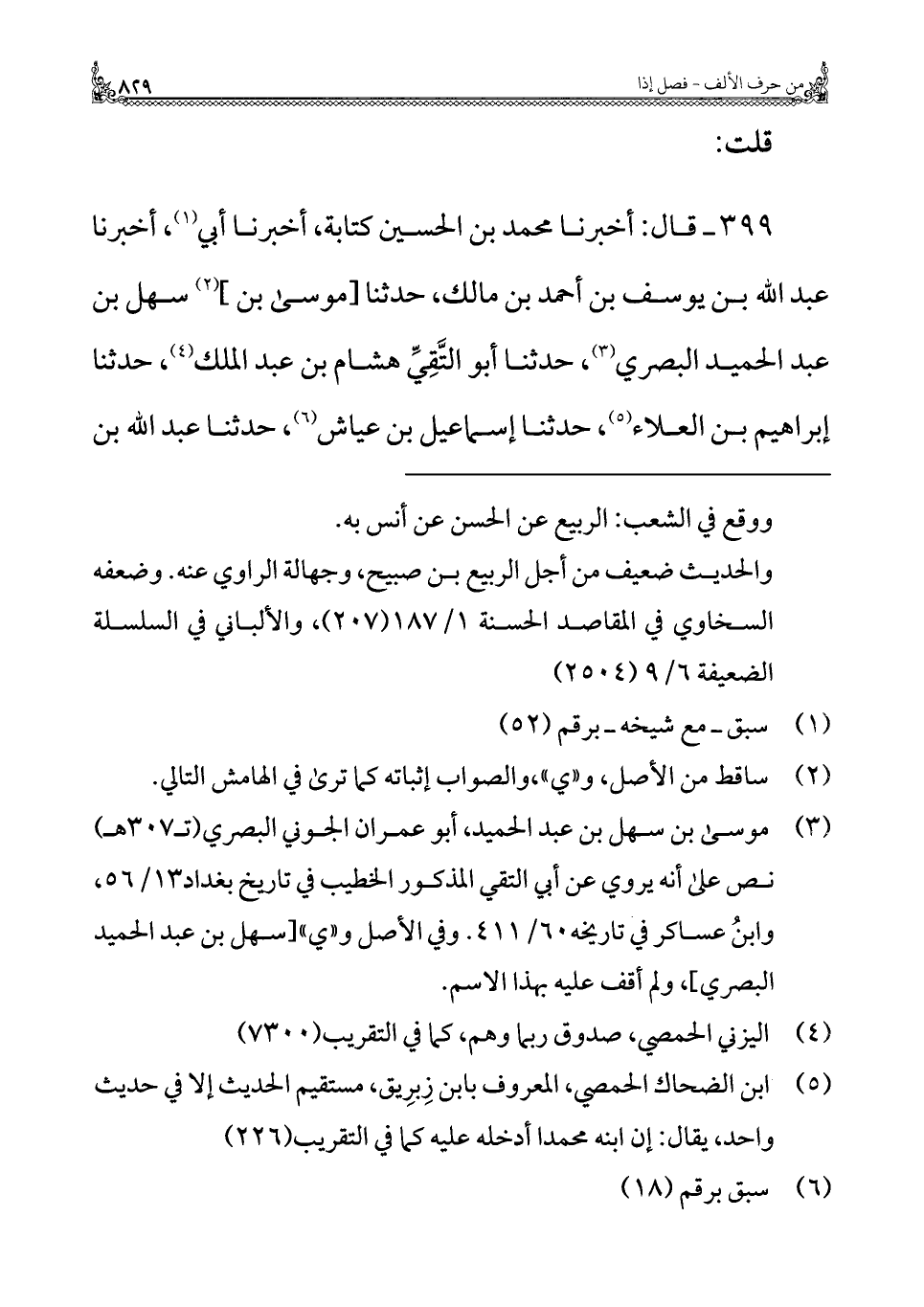 ٣٩٩ - قال: أخبرنا محمد بن الحسين كتابة، أخبرنا أبي (¬١)، أخبرنا عبد الله بن يوسف بن أحمد بن مالك، حدثنا [موسى بن] (¬٢) سهل بن عبد الحميد البصري (¬٣)، حدثنا أبو التَّقِيِّ هشام بن عبد الملك (¬٤)، حدثنا إبراهيم بن العلاء (¬٥)، حدثنا إسماعيل بن عياش (¬٦)، حدثنا عبد الله بن