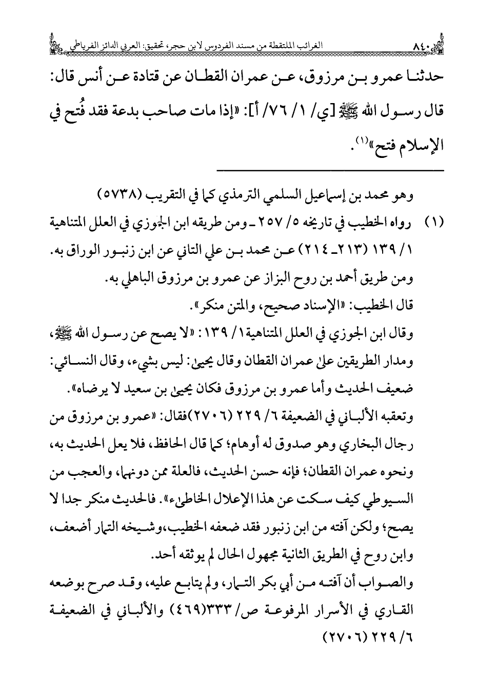 حدثنا عمرو بن مرزوق، عن عمران القطان عن قتادة عن أنس قال: قال رسول الله - صلى الله عليه وسلم -: "إذا مات صاحب بدعة فقد فُتح في الإسلام فتح" (¬١).