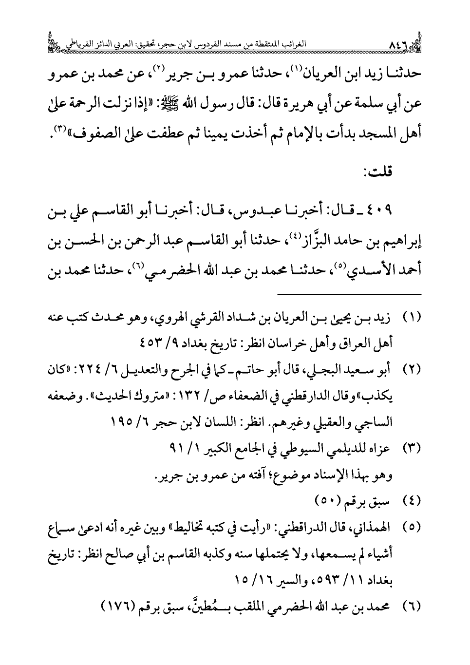 حدثنا زيد ابن العريان (¬١)، حدثنا عمرو بن جرير (¬٢)، عن محمد بن عمرو عن أبي سلمة عن أبي هريرة قال: قال رسول الله - صلى الله عليه وسلم -: "إذا نزلت الرحمة على أهل المسجد بدأت بالإمام ثم أخذت يمينا ثم عطفت على الصفوف" (¬٣).